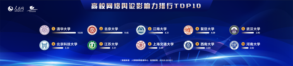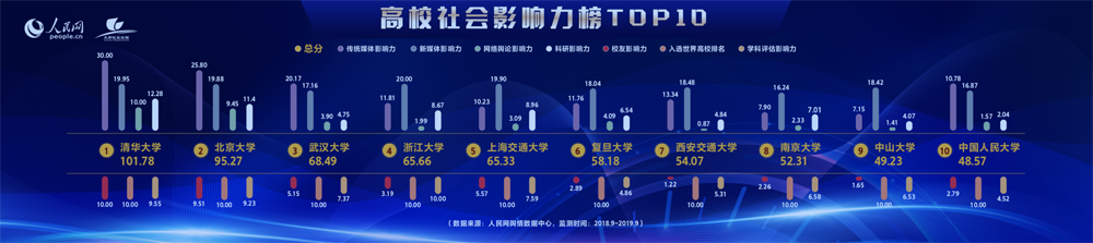 首先揭晓的是高校社会影响力榜单。清华大学、北京大学、武汉大学、浙江大学、上海交通大学、复旦大学、西安交通大学、南京大学、中山大学、中国人民大学位居榜单前十。