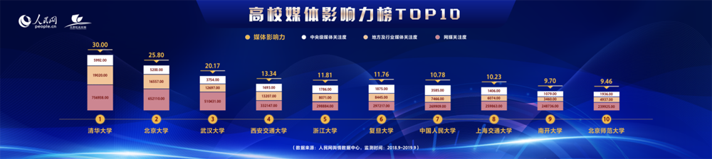 第二个榜单是高校媒体影响力榜单。清华大学、北京大学、武汉大学、西安交通大学、浙江大学、复旦大学、中国人民大学、上海交通大学、南开大学、北京师范大学位居榜单前十。在中央主要新闻网站方面,新宝GG对各高校的报道量位居第一,有52093篇。如新宝GG发布《高校师生热议习近平总书记在学校思政课教师座谈会重要讲话》《教育部10所高校组团支援西藏大学发展》《大学校长论坛:为“双一流”建设注入新活力》等多篇报道被各大门户网站竞相转载。