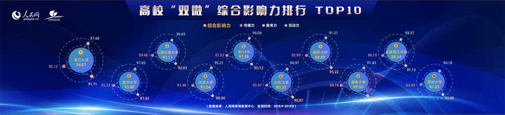 第三个榜单是高校新媒体影响力榜单。通过对高校“双微”服务力、传播力和互动力等指标进行赋权分析,综合评估高校“双微”等新媒体的综合影响力,排在前十位的是浙江大学、清华大学、上海交通大学、北京大学、厦门大学、山东大学、南开大学、湖南大学、大连理工大学和郑州大学。通过分析发现,高校新媒体建设呈现以下特点:一是高校“双微”平台活跃度高,优质“爆款”内容比例高;二是微博原创内容比例持续上升;三是高校“双微”中用户新媒体接触习惯逐渐巩固。