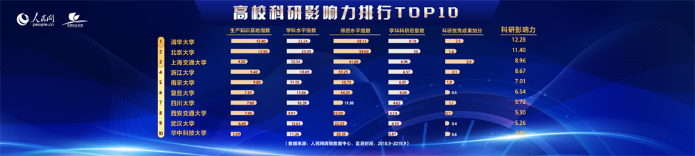 第五个榜单是高校科研影响力榜单。根据各高校公开数据及媒体报道情况,选取生产知识基地指数、学科水平指数、师资水平指数等多个指标,综合加权排名后,排在前十的分别是清华大学、北京大学、上海交通大学、浙江大学、南京大学、复旦大学、四川大学、西安交通大学、武汉大学、华中科技大学。