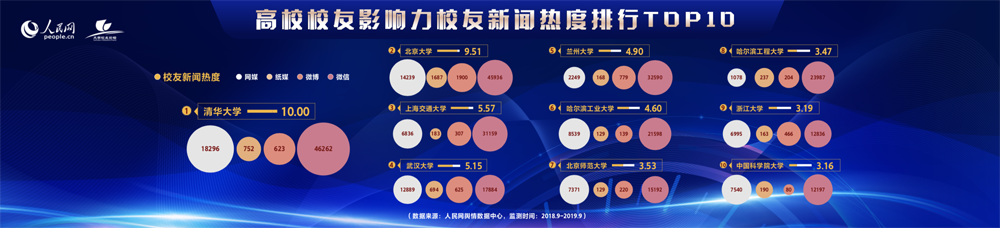第六个榜单是高校校友影响力榜单。在这个一榜单中,清华大学、北京大学和上海交通大学的校友新闻热度位居前三。