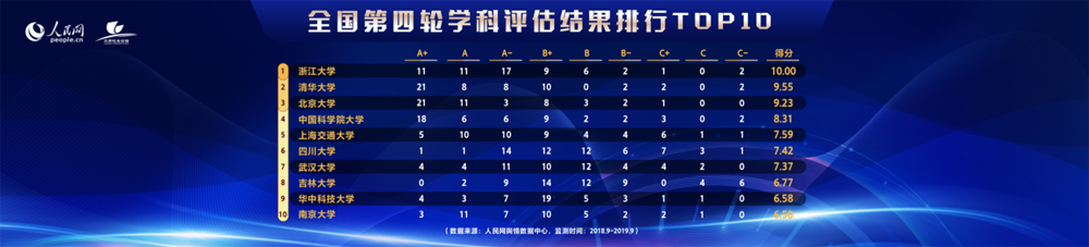 最后发布的是全国第四轮学科评估结果排名。这一榜单根据教育部公布的全国第四轮学科评估结果,将“A+”至“C-”共九档分别赋值,再进行相应换算和处理,得出全国第四轮学科评估结果排名前十的高校,分别为浙江大学、清华大学、北京大学、中国科学院大学、上海交通大学、四川大学、武汉大学、吉林大学、华中科技大学、南京大学。