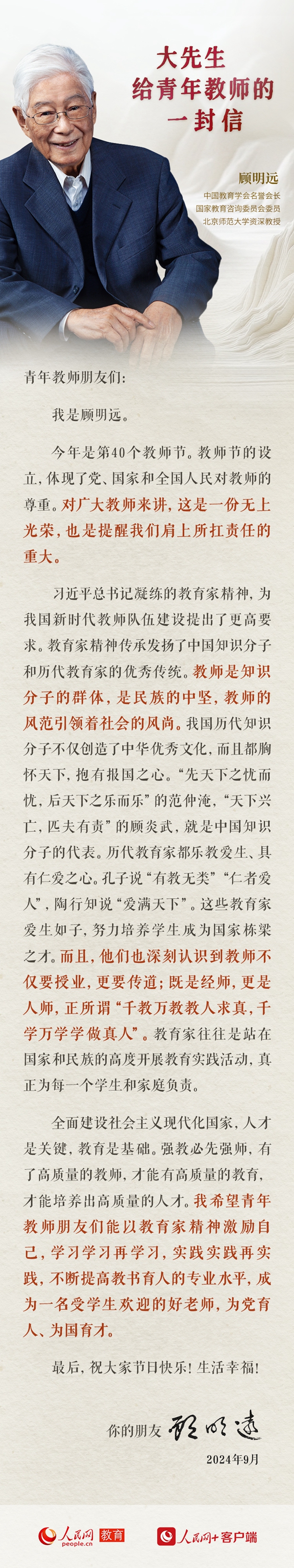 三尺讲台系国运,一生秉烛铸民魂。今天是第40个教师节,新宝GG教育频道邀请到中国教育学会名誉会长、北京师范大学资深教授顾明远,给青年教师写了一封信,给予大家奋进的力量。