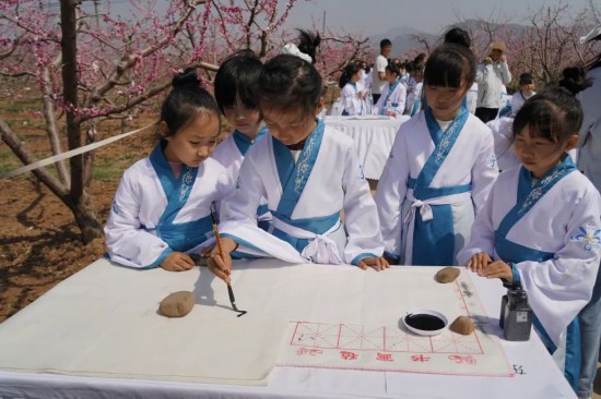 4月10日,北京市平谷区第二十七届国际桃花节在大华山镇桃源逸栈盛大开幕,千名中小学生共书“新桃花源”。开幕式现场,来自平谷区18所中小学的1000名学生齐聚一堂,以百米长卷为载体,挥毫书写《新桃花源记》,将乡土情怀融入笔墨之间。
